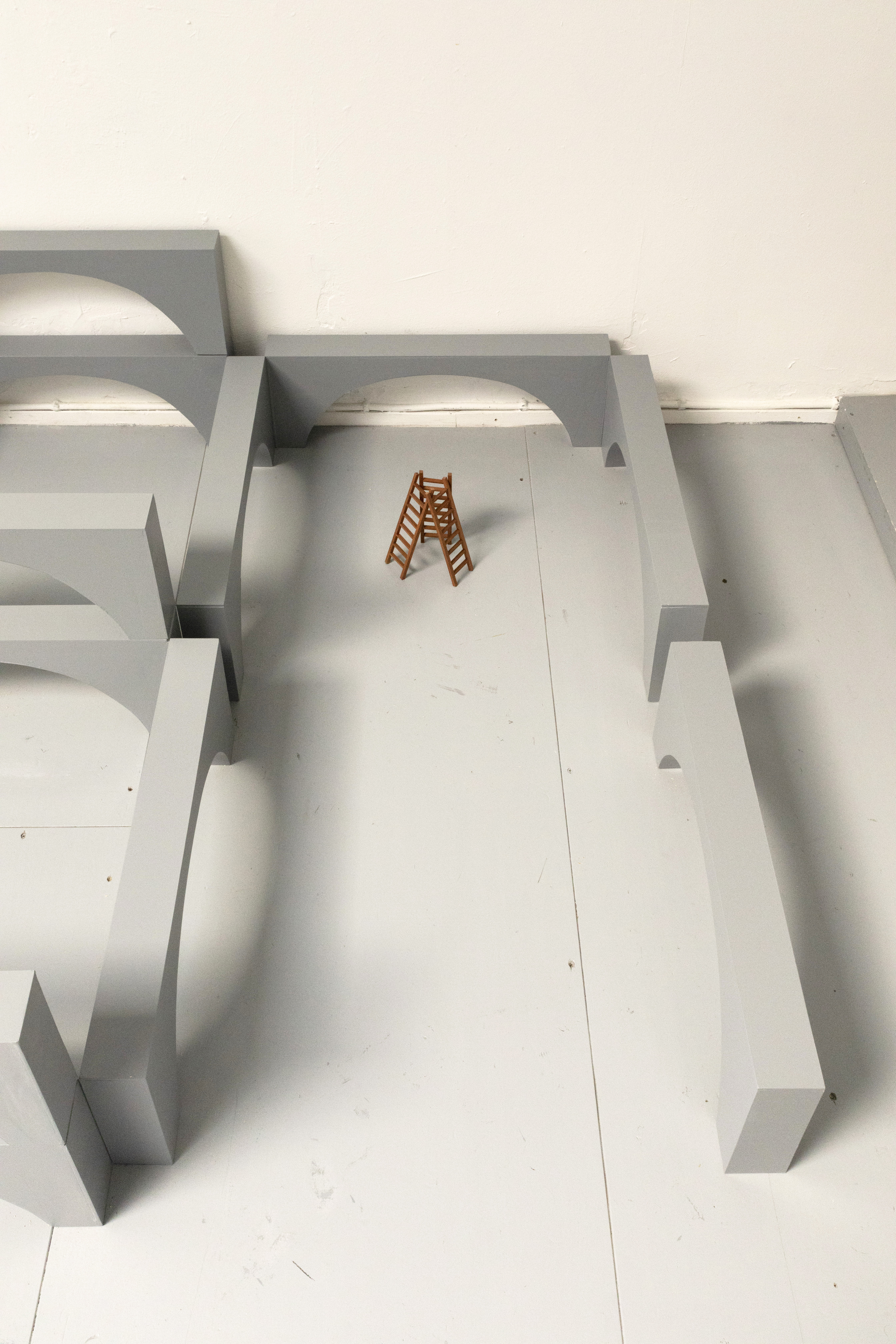 Along the sculptural grid photographic silkscreen prints of the almost organically textured vaults underneath the building are added, creating a tension between the geometrical and model-like arches in space and the actual hidden ones underneath the building. These arches and silkscreen are also accompanied by smaller hidden sculptures in and between the piled up arches.